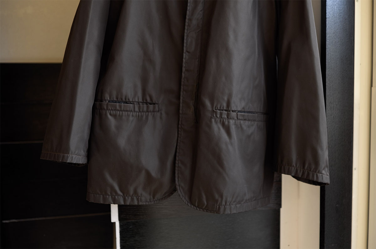スポーツジャケット型と思わせて胸ポケット付きでテーラードジャケットのスタイルバランスという相も変わらず“読めない”ミウッチャさんのファッション哲学でこのバランスは初めて出逢いました、そんで1995-1997sのメンズ最初期ピリオド と。でもね私はもう逆に驚かなくなりましたよって言ったら変な物言いですが、自分なりに真摯にVintage PRADA Uomoのファーストラインに向き合い続けることでいかに彼女の世界観が高度過ぎる成熟具合から始まったかをこれまでビシバシと容赦なく実感してきましたから。最初期ピリオドの時点でシルエットバランス及びスタイル提案の軸がない自由型だし独創度合いもクリエイション目線も完成され尽くしていたし ということでそれ以降って最初期ピリオドのアレンジであったり再解釈であったりREテイクの連続じゃない?と思っても致し方ないくらい成熟して完成されていたので。ですからこのようなキメラ系統と出逢ったとしても驚くけど驚きません。