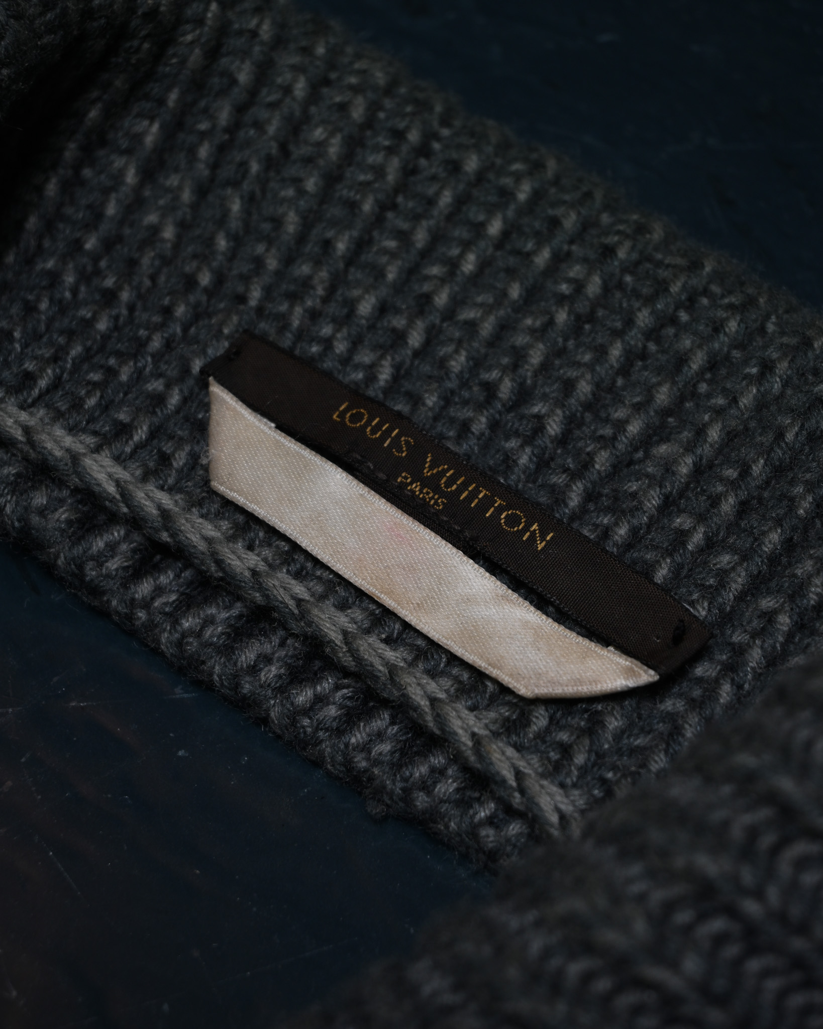 Louis Vuittonからショールカラースタイルのスカーフ。一般的な「巻くためのスカーフ」とは発想が大きく異なります。最大の特徴は、首に巻く行為そのものをデザインの中心に置いていない点です。むしろ、首元に預けるような感覚で成立する、極めて構築的なスカーフと言えます。首に触れる部分は柔らかく、圧迫感を感じさせない一方で、前に垂れるパネル部分はニットの目がしっかり立っています。これにより、無造作に掛けただけでも自然とVラインが整い、スタイリングに品と奥行きが生まれます。
