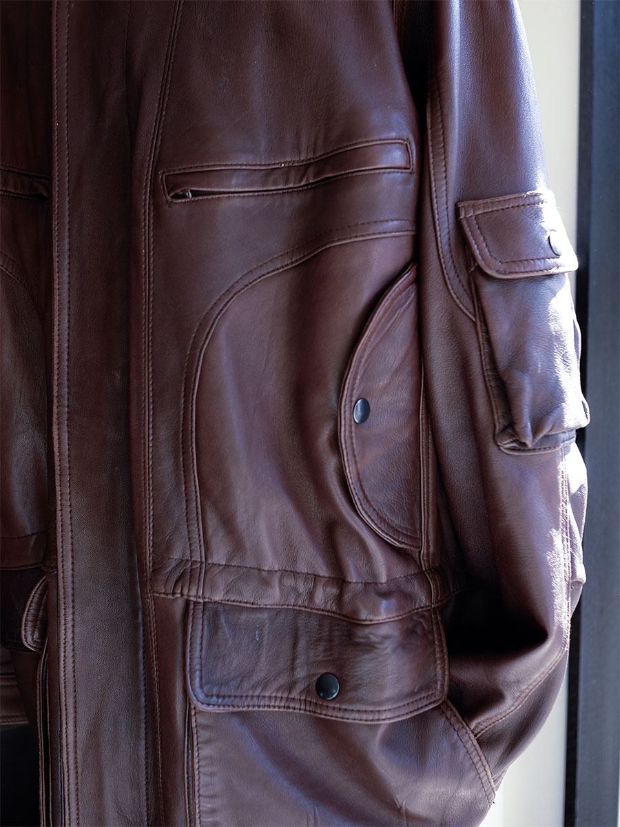 胸元ポケット,マフポケット,サイドポケットが二重,そんでアヴィエイター的スリーヴポケットという有りそうでなかったマルチ構築かつハーフコートスタイルで少しだけバイカー感が香り立つ補強的なデザインスパイスという各所がかなり“キテ”るこちらは90年代頃と推測されるヨーロピアンアノニマス、匿名特有の何コレ感ギンギンであり稀に出逢えるもしかしたら○○が手掛けたんじゃ!?という不毛で楽しい妄想をギンギンに掻き立ててくれる感性ギンギンなレザープロダクトです。
