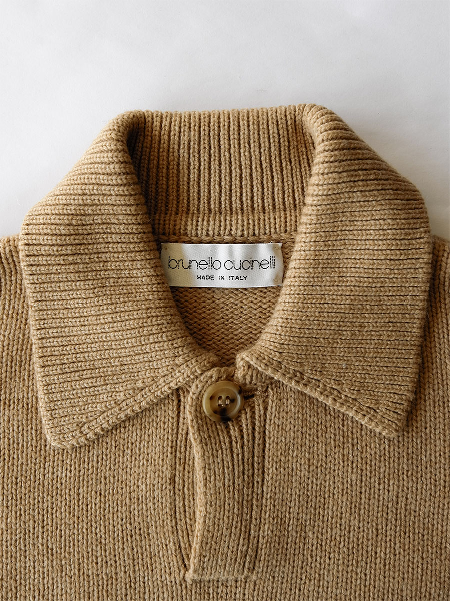イタリアの上質なセーター文化には時代性を反映させた“当時の普通”というスタイルの要素が際立つのですが、時代を経ることによってそれらの普通が個性となり結果的にデザインスタイルと成るのは弊店にとって何より興味深く楽しく思えること。昨今のブルネロ・クチネリは御存知の通り総合的なファッションブランドの位置付けですが、この頃は御存知の通り純然かつ素朴なニットメーカーでしたから前述の要素性は顕著でして、特有のボンバーシルエットはまさに近代におけるデザイン性豊かなセータースタイル。ところでニットポロで首元のボタン一つってだけでこんなにもコンテンポラリーな雰囲気漂うって知ってました?